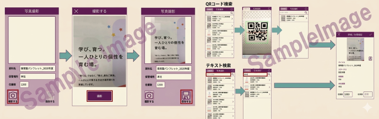 パンフレット管理(登録)アプリと連携するアプリで、スマートフォンから写真を撮影し、プロパティ情報を付加してSharePointのドキュメントライブラリに保存できます。保存された写真は一覧表示され、QRコード検索やテキスト検索による検索が可能です。また、詳細画面ではパンフレット数の増減を反映することができます。