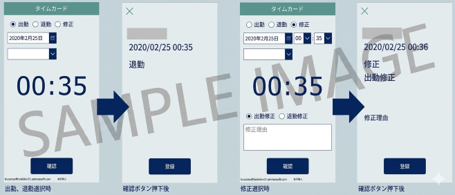 出勤・退勤、修正の入力内容をGoogleスプレッドシートに保存します。出勤・退勤の選択は指定した時間になると自動的に切り替わり、最短で確認ボタンと登録ボタンのタップのみで登録完了です。修正を選択すると非表示の項目が表示されます。