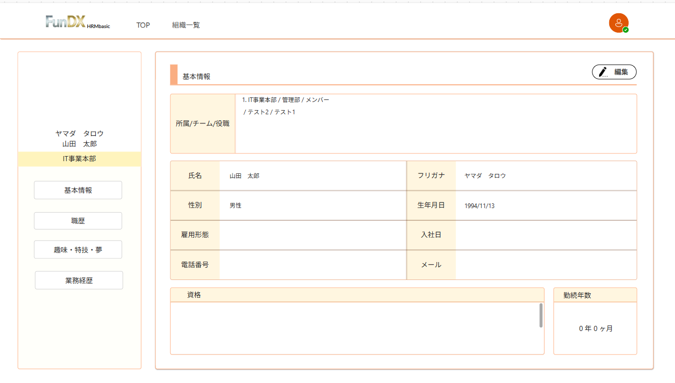 プロフィール画像、氏名、部署、基本情報、勤続年数、ランクなどを表示できるため、単なる社員名簿ではなく、社内コミュニケーションを促進するプロフィール基盤として活用できます